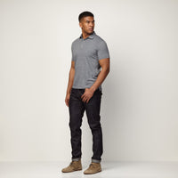 Un polo moderne à la coupe ajustée et au col assorti. Nous avons filé une âme en laine de 17,5 microns avec deux petits filaments de nylon pour augmenter la durabilité, réduire le boulochage et améliorer la résistance au rétrécissement. Vous ne trouverez ce tissu nulle part ailleurs.